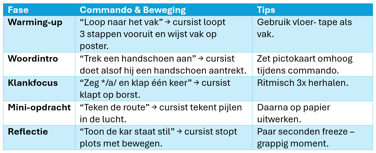Didactische tip: combineer TPR met echo‑lezen. Laat cursisten eerst de beweging doen, daarna de bijbehorende zin hardop zeggen.
