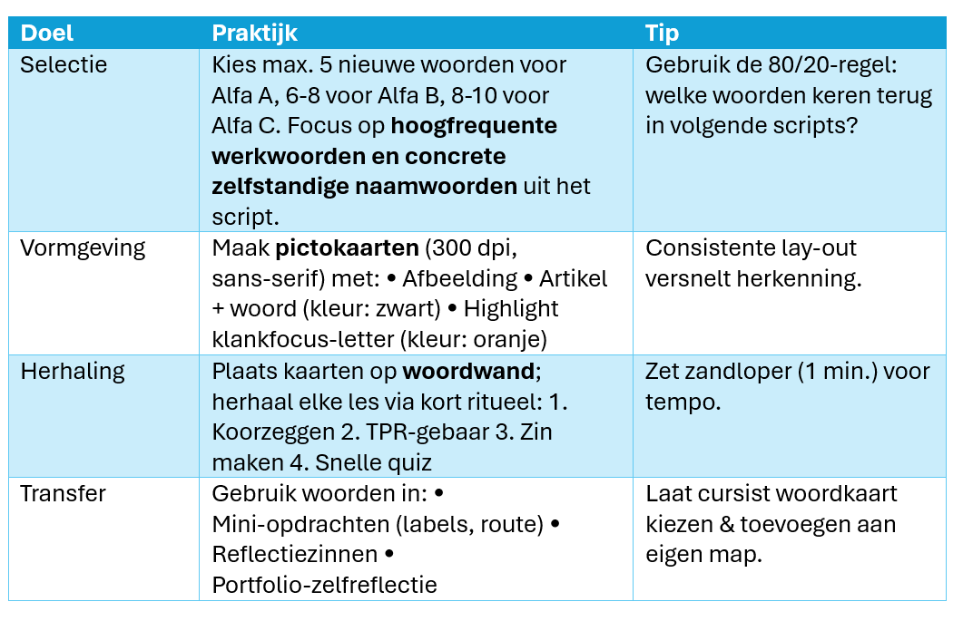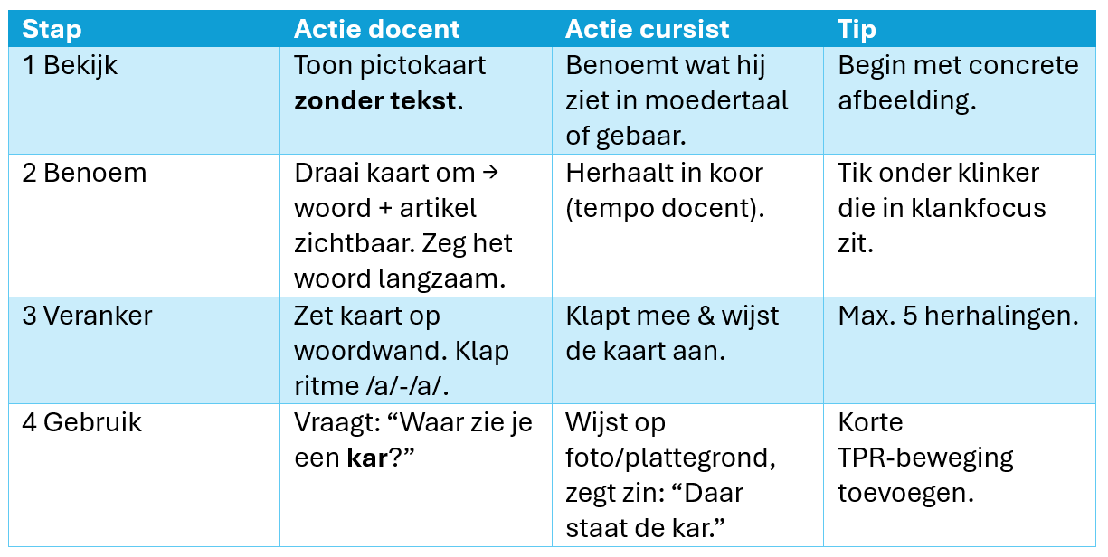 Laat cursisten betekenis ↔ woordbeeld ↔ klank meteen koppelen.