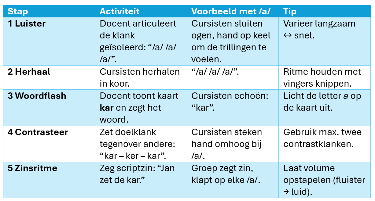 Een klankdrill is een korte, ritmische oefening die cursisten helpt een doelklank (bijv. /a/) snel te herkennen en correct uit te spreken.