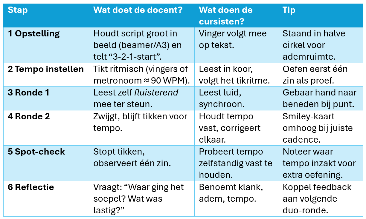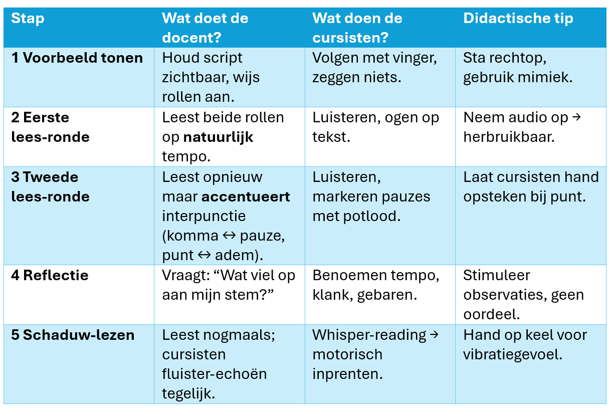 Tijdens het modellezen laat de docent in slechts drie minuten horen hoe de dialoog moet klinken: tempo, intonatie, pauzes en emotie. Dit vormt een auditief "sjabloon" dat cursisten in de volgende leesrondes nabootsen.