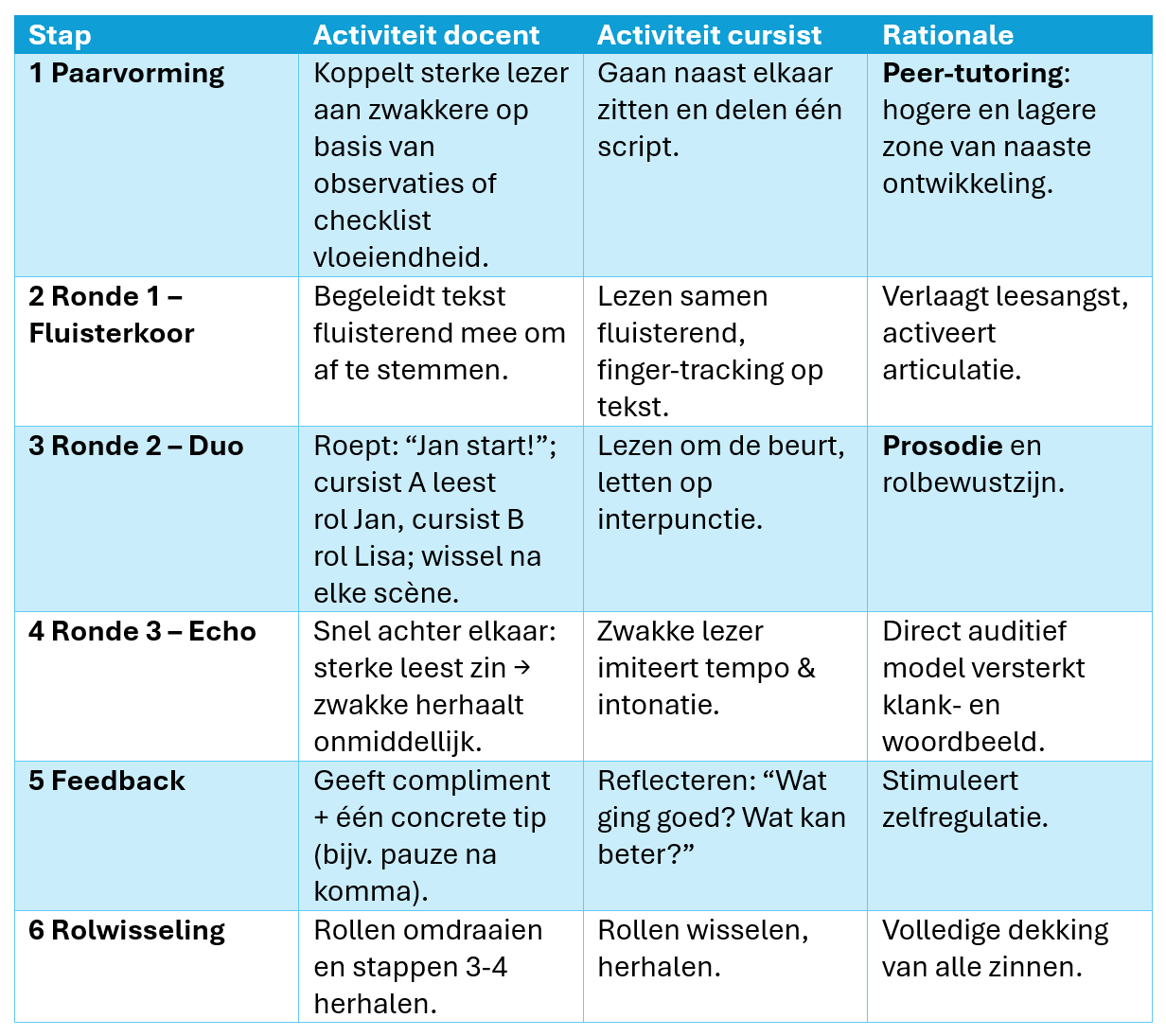 Duo‑lezen laat twee cursisten om de beurt zinnen voorlezen; Echo‑lezen voegt daar een extra laag ondersteuning aan toe: de sterke lezer leest eerst, de zwakkere echoot direct dezelfde zin. Zo krijgt elke deelnemer een passend model en voldoende oefentijd.