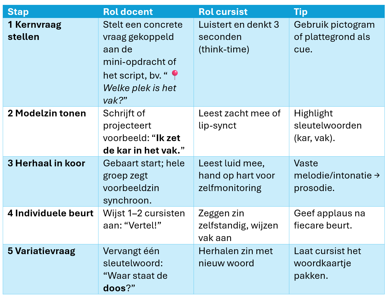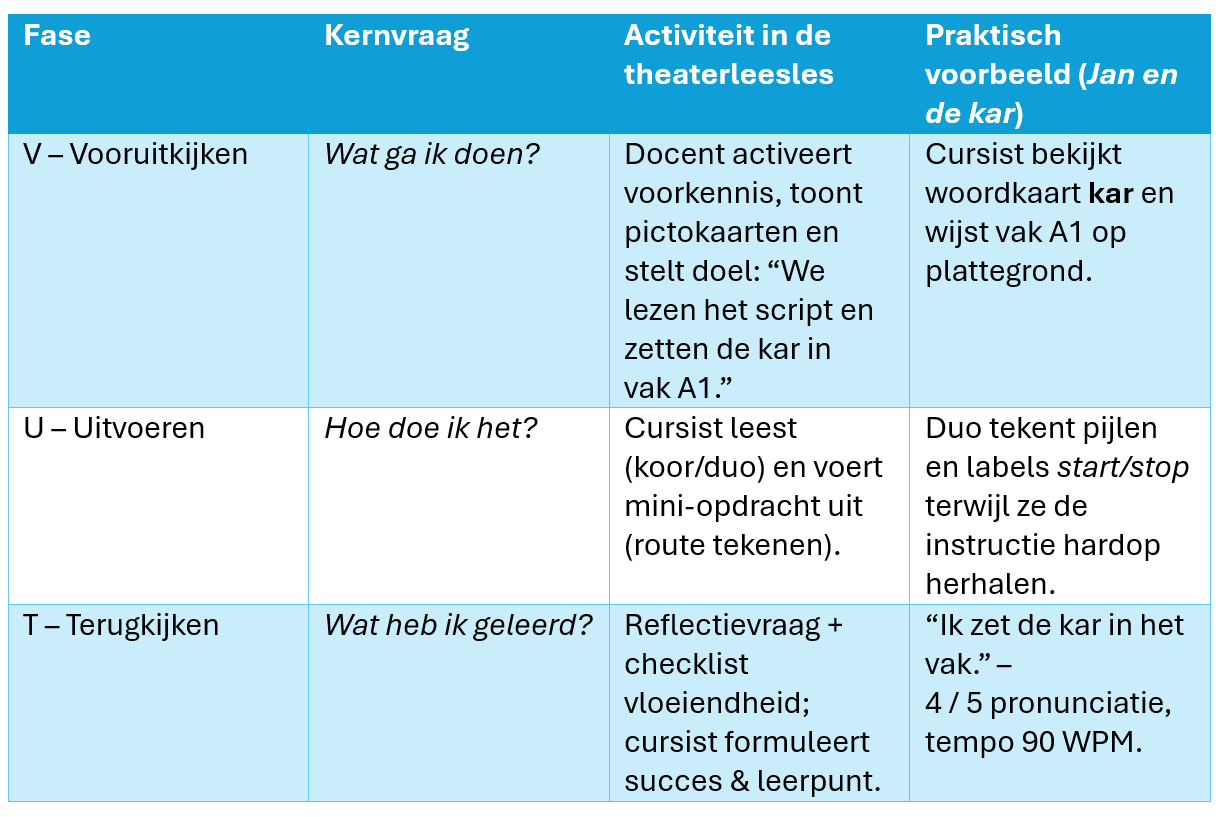 Tip voor de docent – Maak drie gekleurde kaartjes (groen = V, blauw = U, oranje = T) en laat cursisten ze tonen bij elke fase. Zo visualiseer je het lesritme en houd je de klas gefocust.