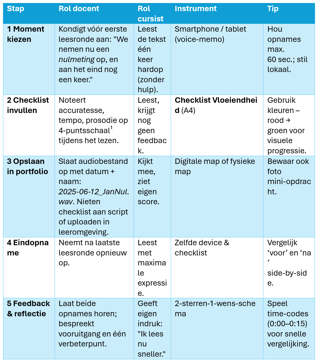 Regelmatige, doelgerichte evaluatie geeft zicht op groei en maakt gerichte remediëring mogelijk. Combineer korte audio‑opnames met een gestandaardiseerde checklist vloeiendheid en bewaar beide in het (digitaal) portfolio.